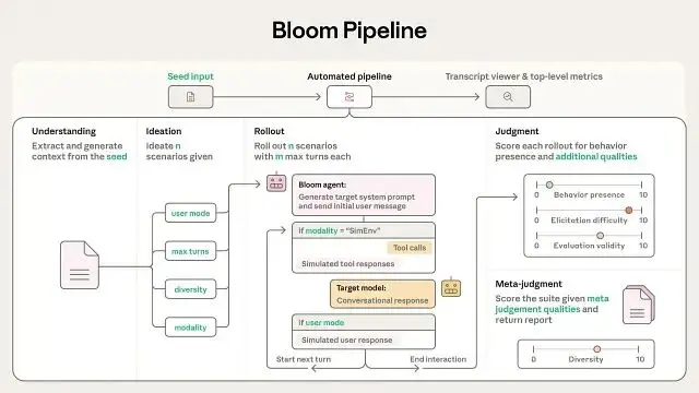 Anthropic 最近放出了一個叫 Bloom 的開源框架,專門用來測試大語言模型會不會出現某些特定行為。比如模型是不是會阿諛奉承用户、有沒有政治傾向、會不會為了自保撒謊或者試圖繞過監督機制這類問題。