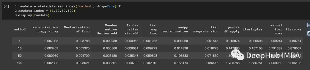 創建一個空DF,編寫一個函數將輸出%%timeit作為一行添加到數據框中