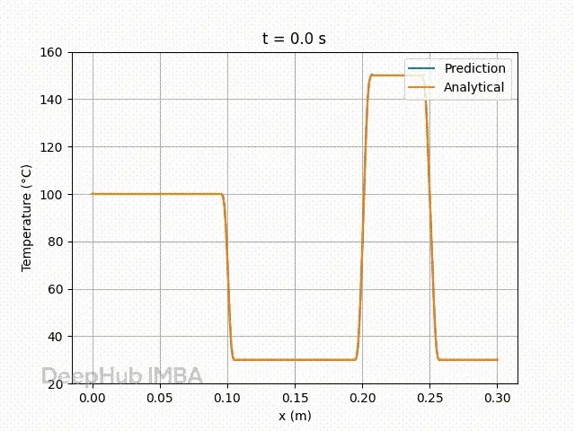 符合預期,t=0時的預測就是初始條件的插值,x=0 m和x=0.3 m處的温度值精確等於設定的邊界温度(Dirichlet邊界條件)。