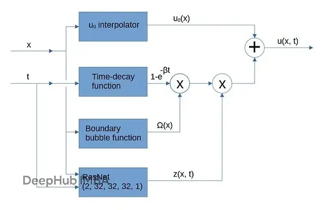 方程(1)給出了一種強制u(x, 0) = u₀(x)的方式。β是常數或者可訓練的時間衰減參數,決定了從初始狀態到熱擴散狀態的過渡期長短。任意函數v(x, t)是神經網絡的輸出,不過還有點額外的處理。