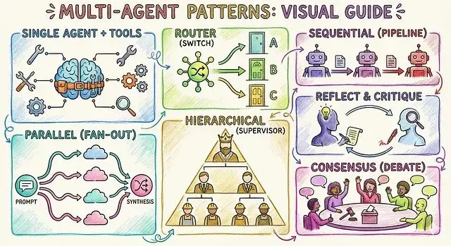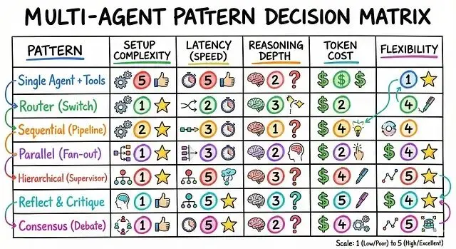 設計多智能體系統更像管理團隊,而不是寫代碼。先用單智能體跑起來。如果工具太多扛不住了,就改路由模式。任務複雜、步驟多,上順序或層級架構。要追求完美輸出,加反思循環。
