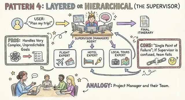 頂層有個"經理"智能體,不幹具體活兒,只負責拆解任務、分配給下面的"工人"智能體。