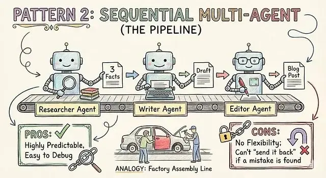實際案例:博客生成流水線。研究員智能體找素材,寫作智能體出草稿,編輯智能體查語法,三步串行。