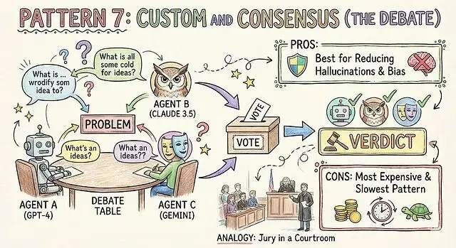 多個不同"人設"或底層模型的智能體(比如 GPT-4 和 Claude 3.5)獨立求解同一問題,然後投票或辯論,選出最可能正確的答案。這是減少幻覺和偏見的效果最好的方法,但也是最貴的。