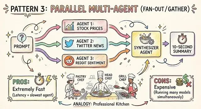 應用場景:市場分析系統。一個智能體抓股價、一個盯推特、一個掃 Reddit 情緒,並行跑完 10 秒出報告。