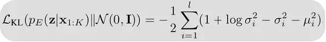 KL 組件懲罰編碼器的高斯後驗 pE(z ∣x)(由其均值和方差參數化)與固定先驗 N(0,I ) 之間的散度,從而鼓勵每個輸入的潛在表示遵循該先驗分佈,公式摘自原始 CALM 論文。
