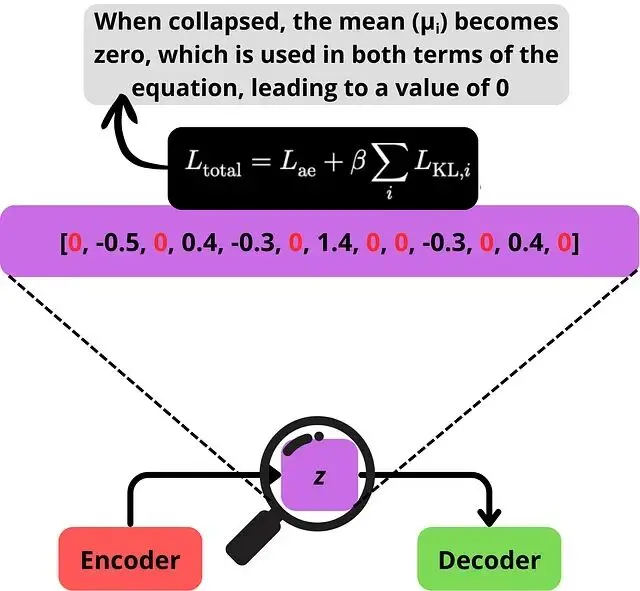 第一,潛在空間信息貧乏,得到的是稀疏嵌入而非密集嵌入。模型發現少數幾個維度就能承載所需信息,其他維度多餘。第二,坍縮的維度給解碼器注入純噪聲,因為它們只是從沒有信號的高斯分佈採樣。解碼器拿不到真實的token。