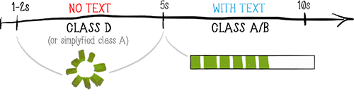 Within this interval, we must give users an indication of input or a request being processed and that the system is responding. Again, the optimal indicator would be a class D or a simplified class A indicator – there is no need to draw a user’s attention to additional information. - Attention span (5–10s)