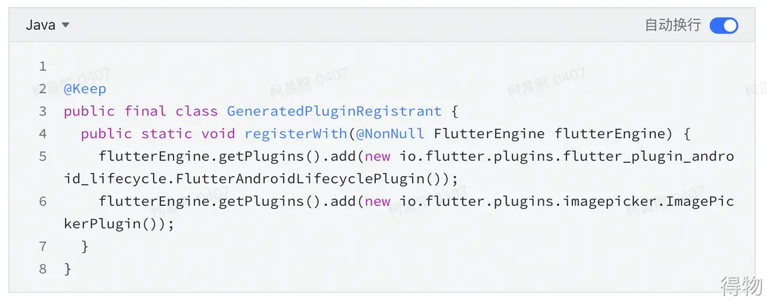 它通過反射找到了GeneratedPluginRegistrant類,並調用了其registerWith方法。這個類我們可以在工程中的 /android/java/目錄下找到,是flutter tool自動生成的,當我們在pubspec.yaml中添加一個插件,並執行pub get命令後即會生成。