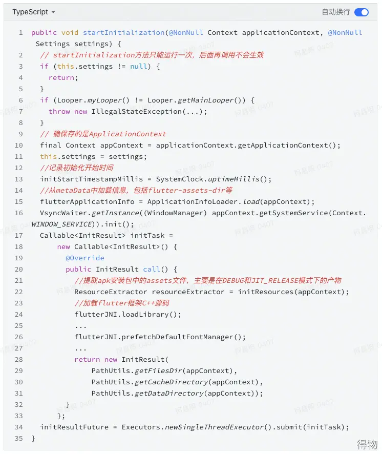 FlutterLoader以單例的形式存在,一個進程只用初始化一次。用來加載apk安裝包中的資源文件和代碼產物,必須在主線程中進行。