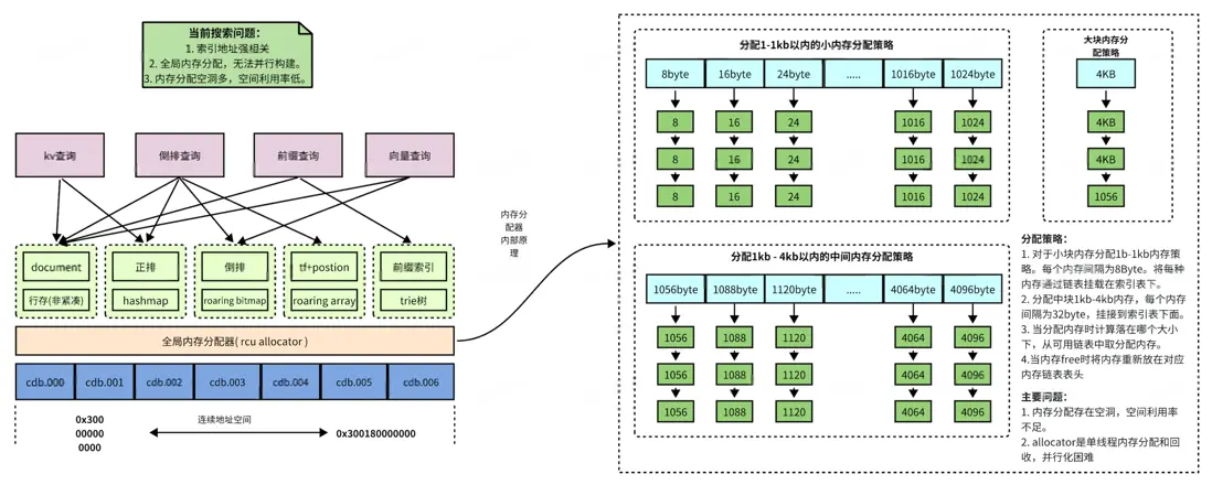 DSearch1.0的索引結構比較特殊一些,總體上使用了全局rcu的設計思想,整體架構上單寫多讀,所以實現了併發高性能無鎖讀,內部數據結構都是無鎖數據結構,所以查詢性能高。在寫操作上因為rcu機制實現寫入無鎖。整體上優點讀性能高,沒有傳統段合併操作帶來的磁盤抖動。缺點是索引地址和操作系統強相關,運維複雜,熱更新受限。全局地址分配難以並行寫入,構建瓶頸明顯。無法對浪費的內存進行回收導致內存空間利用率低,索引空間佔用大。總體結構如圖所示: