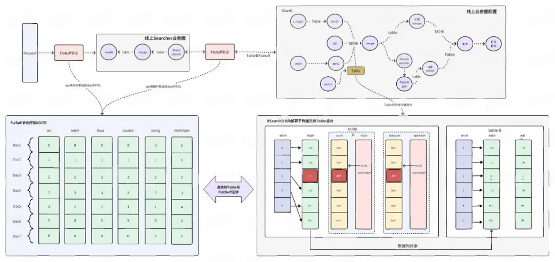 - 兼容引擎索引中doc數據: 引擎索引中doc行式存儲有很多優點,比如多字段訪問效率高等,Table設計中考慮了行式存儲優點,不僅存高頻的列字段也儲存了引擎內部的doc以及對應FieldDef,能直接方便訪問索引數據,接口統一,易於迭代。
