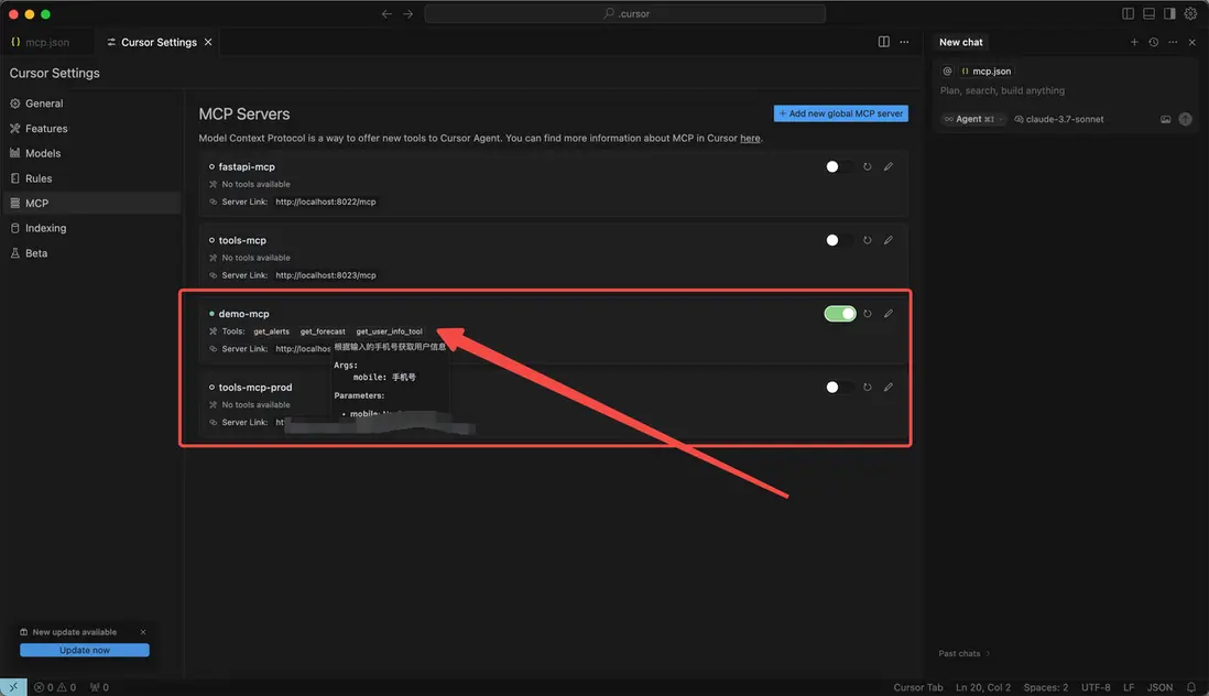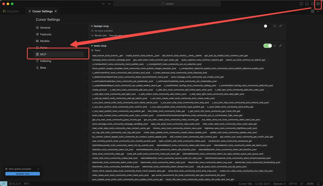 改造完之後的造數服務成功對外暴露了 MCP 服務,現在我們可以通過 MCP 客户端去連接使用了,這裏選用了 Cursor,因為 Cursor 使用的人比較多,同時集成了市面上的主流大模型。