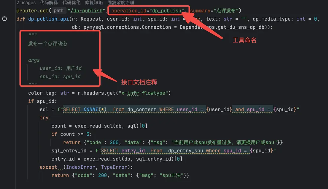 AI 調用接口的準確性高度依賴代碼註釋的清晰度。通過優化接口文檔(如參數默認值、輸入格式説明),可顯著提升 Agent 的任務解析成功率。