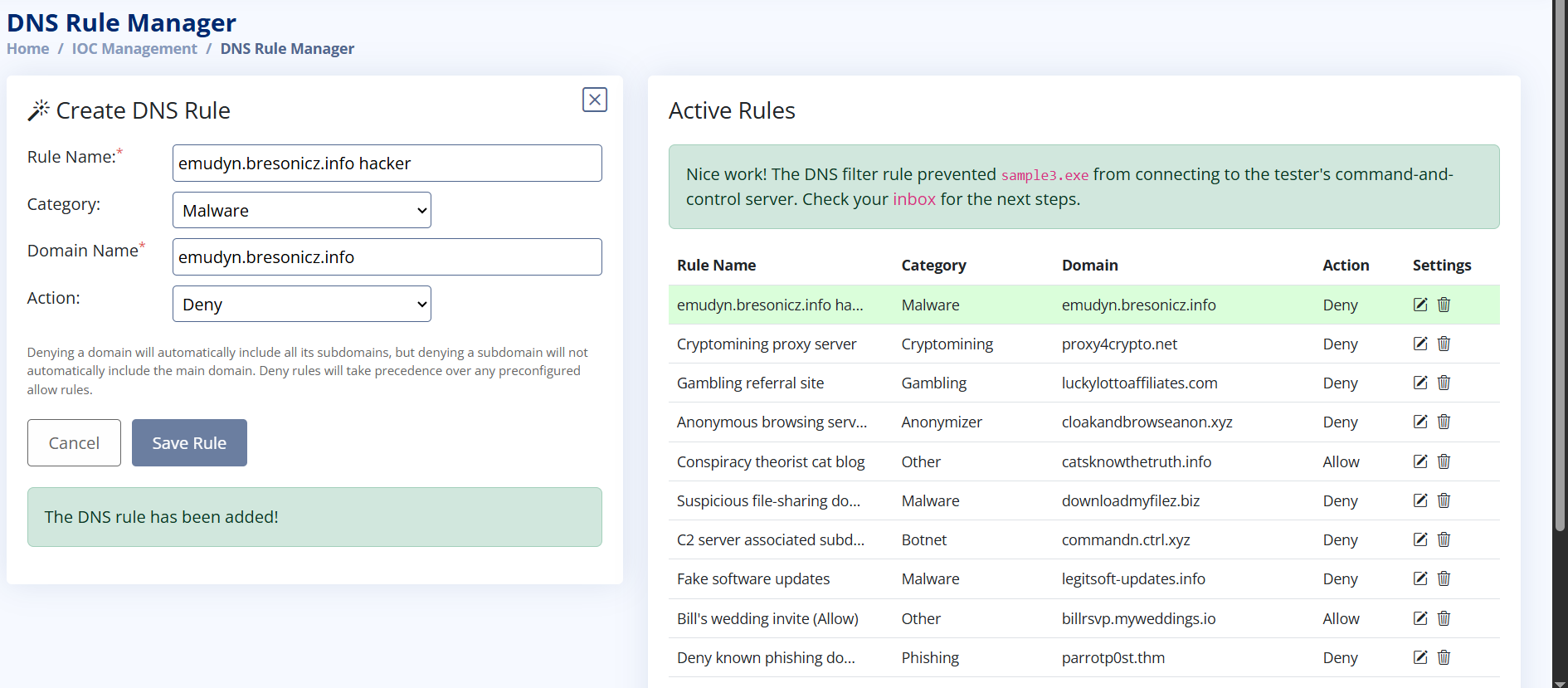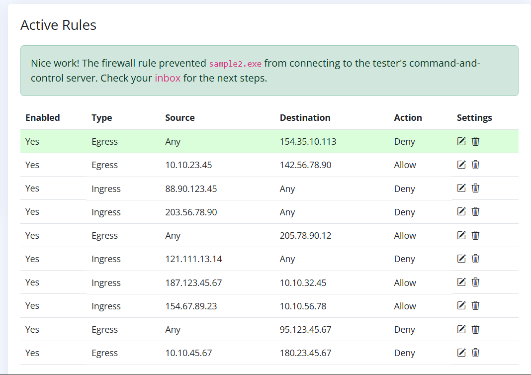 在經歷了太多次安全事件響應活動後,PicoSecure 決定開展威脅模擬和檢測工程演練,以增強其惡意軟件檢測能力。您已被指派與外部滲透測試人員合作,參與一個迭代式的紫隊演練場景。測試人員將嘗試在模擬的內部用户工作站上運行惡意軟件樣本。與此同時,您需要配置 PicoSecure 的安全工具,以檢測並阻止惡意軟件的運行。