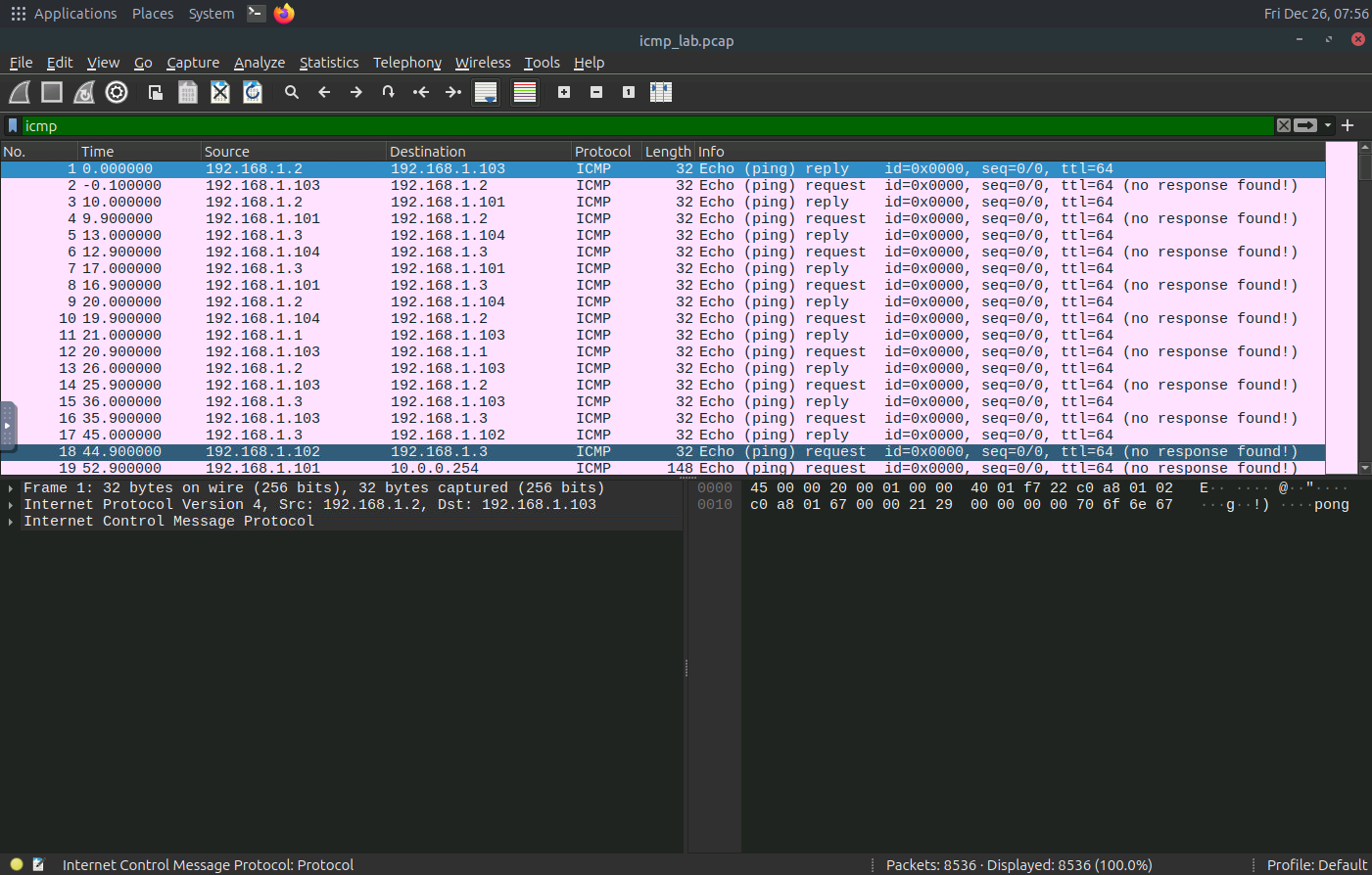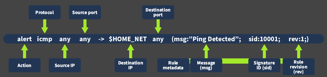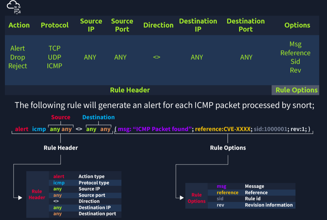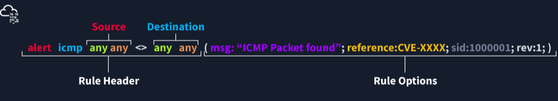 alert icmp any any <> any any (msg: "ICMP Packet Found"; sid: 100001; reference: cve , CVE -XXXX; rev:1 😉 |