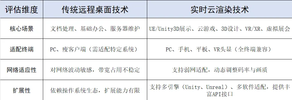 從場景適配來看,傳統遠程桌面技術是“辦公場景的最優解”,而實時雲渲染技術是“高負載實時圖形場景的專屬解”。當應用場景從“處理文檔”轉向“渲染高清動態圖形”,技術選擇的切換就成了必然。