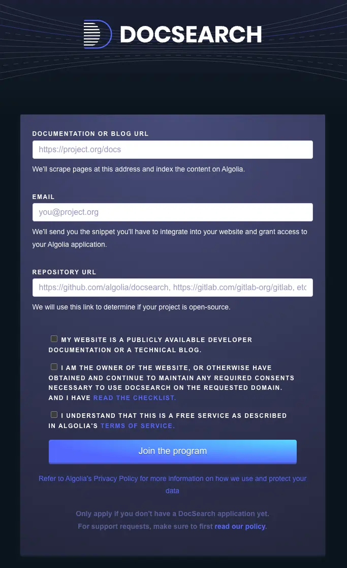 前置條件準備完成後, 就可到 Docsearch 註冊