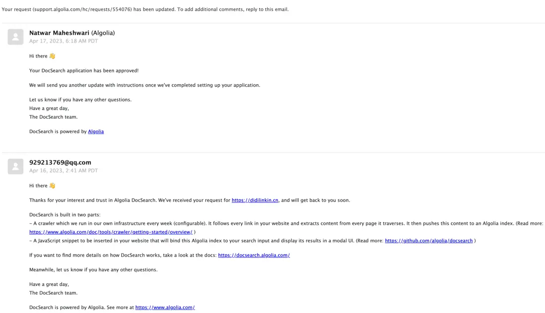 Docsearch 每週一次爬取網站 (可在網頁界面上配置具體時間), 並將所有內容彙總到一個 Algolia 索引中