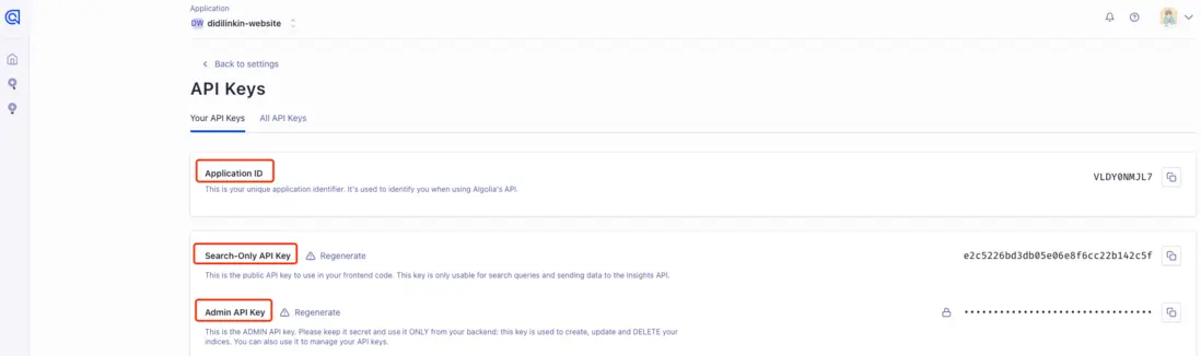 APPLICATION_ID=Application ID API_KEY=Admin API Key # 務必確認, 這是坑點 不要用 'Write API Key' 或者 'Search API Key'