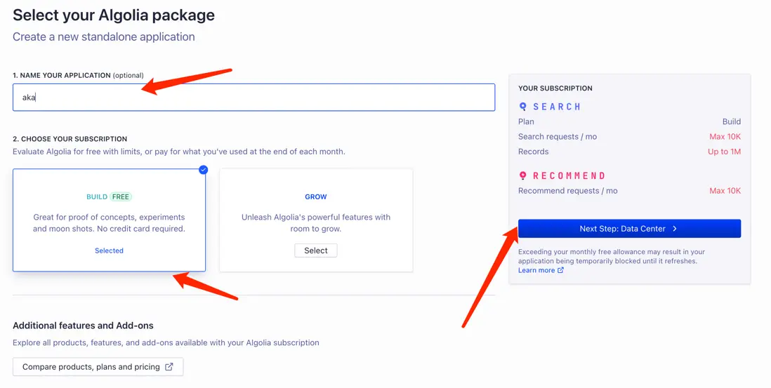 前往 Algolia 官網, 登錄賬户 創建 Application