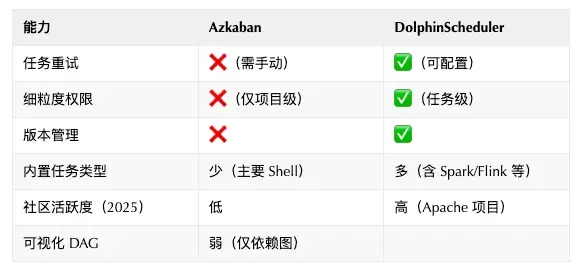 Azkaban 的權限模型只有“項目級別”的讀寫權限,無法做到“用户A只能編輯任務X,不能動任務Y”。在多團隊共用一個調度平台時,權限混亂導致誤操作頻發。