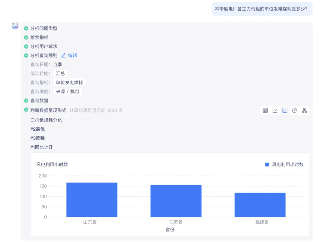 基於前期系統化的火電行業指標體系梳理和業務語義的統一,指標平台能夠精準解析用户意圖,自動調用相應指標定義、數據源與可視化模板進行應答。目前,該智能問數功能已逐步集成至集團數據門户與移動端平台,有效覆蓋大部分日常管理類數據查詢需求,顯著提升數據獲取的便捷性與分析效率,讓原本依賴專業報表團隊人工響應的問題轉變為員工自助式、即時性完成,從而有效推動了指標數據在各層級業務中的主動應用與價值釋放。
