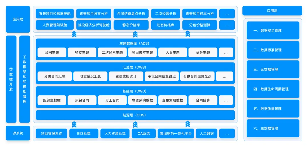 - 數據倉庫建設——主題彙總與應用數據服務:在數據湖的基礎上,按照集團核心業務主題域(如財務績效、項目全生命週期管理、供應鏈與採購、安全質量環保、人力資本、合規風控等)進行數據建模與組織,構建企業級數據倉庫。數據倉庫包含彙總數據層,用於存儲面向特定分析主題的輕度彙總數據和寬表,以及應用數據層,直接服務於上層報表、駕駛艙及指標計算。