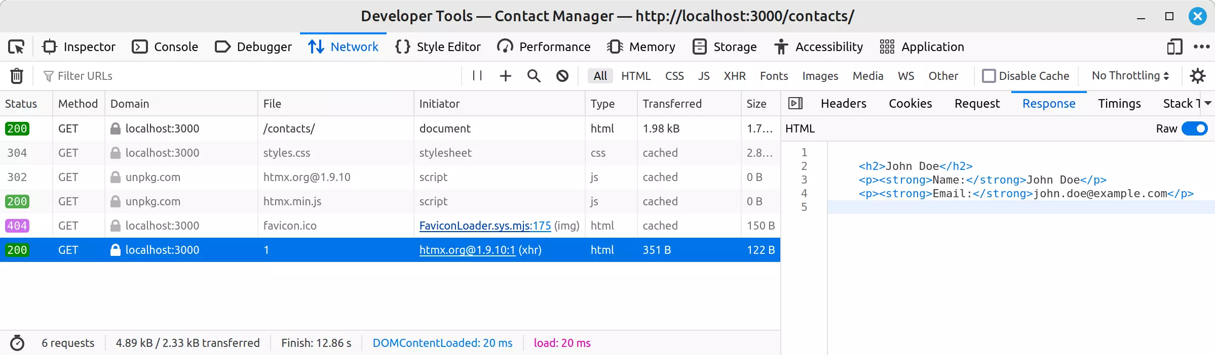 這將在聯繫人詳細信息下方添加一個編輯聯繫人按鈕。正如我們之前所見,當單擊鏈接時, hx-get 將通過 Ajax 向 /${contact.id}/edit 端點發出 GET 請求, hx-target 將指定插入位置響應, hx-push-url 將確保 URL 發生更改。