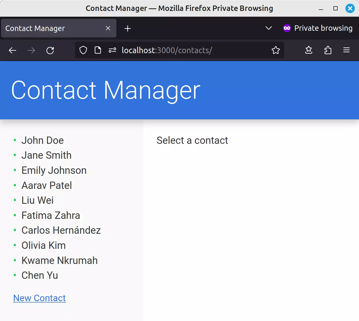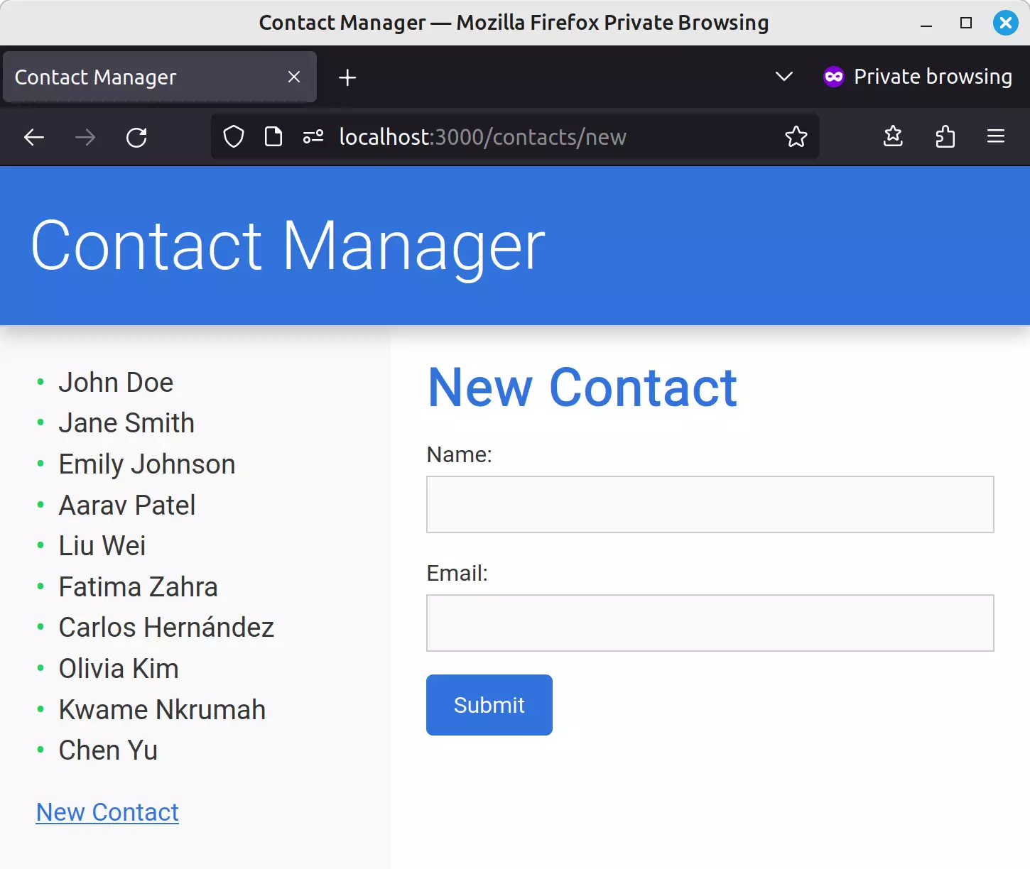 我們將開發一個簡單的聯繫人管理器,能夠執行所有 CRUD 操作:創建、讀取、更新和刪除聯繫人。通過利用 htmx,該應用程序將提供單頁應用程序 (SPA) 的感覺,從而增強交互性和用户體驗。