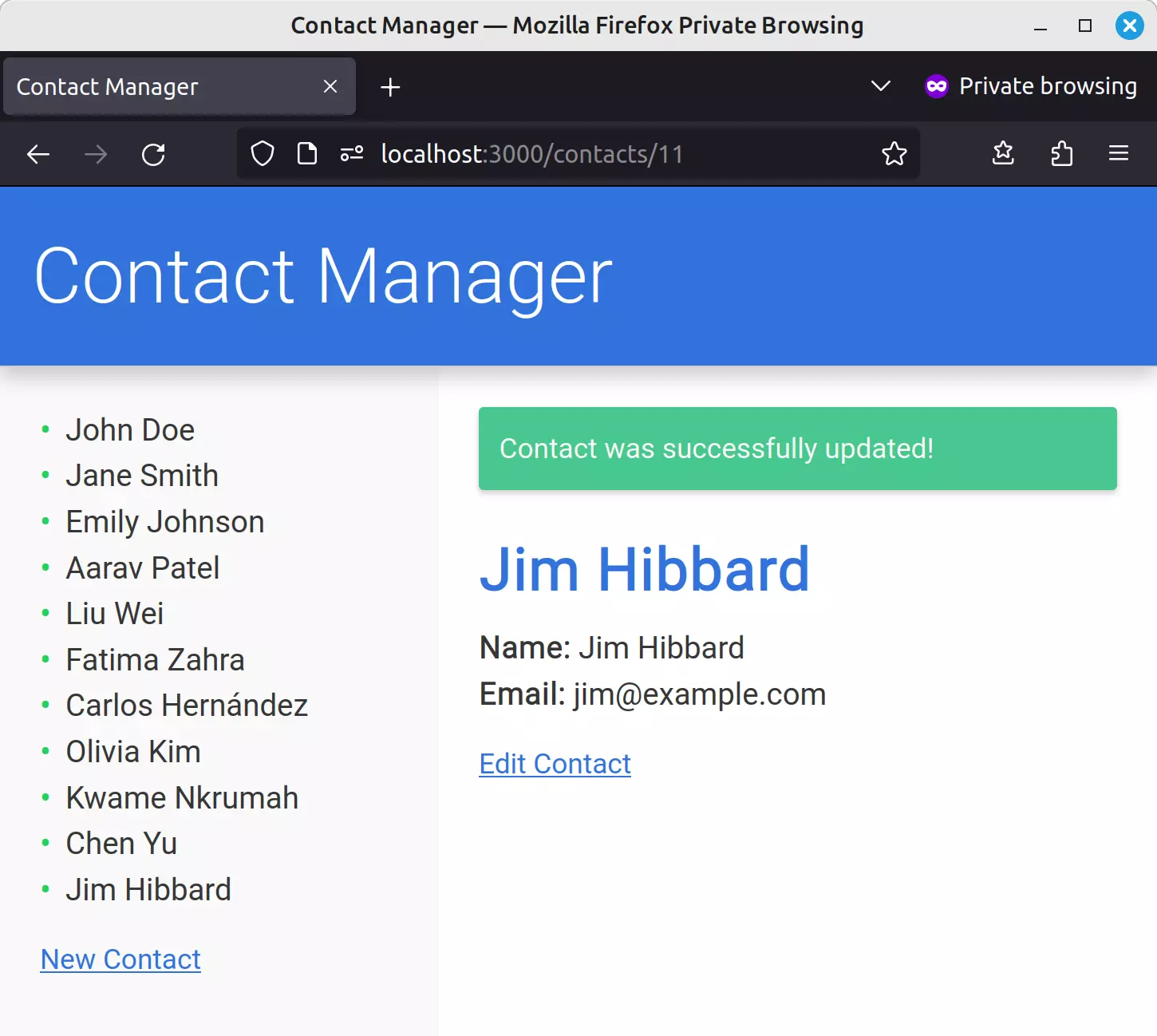 希望現在沒有什麼太神秘的事情了。在處理程序的開頭,我們從請求參數中獲取聯繫人 ID。然後,我們找到想要更新的聯繫人,並將其替換為根據我們收到的表單數據創建的新聯繫人。
