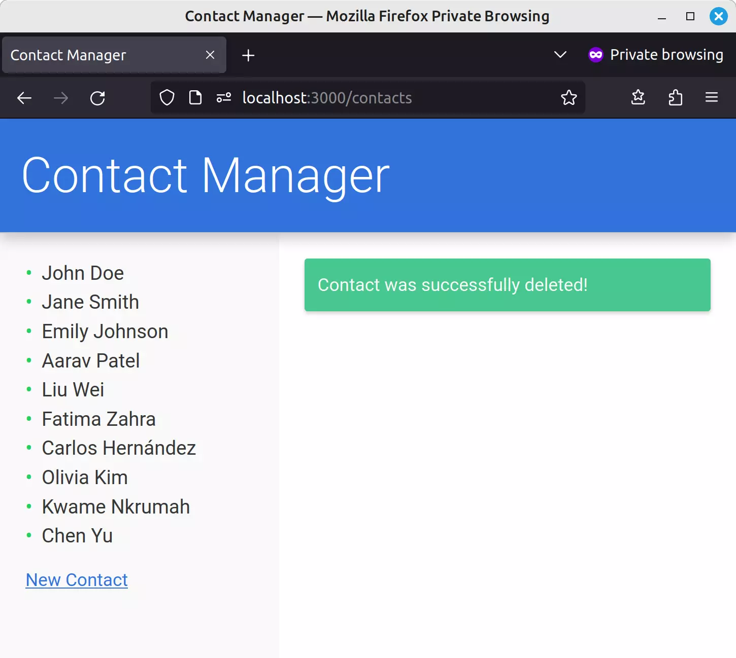 刪除聯繫人後,我們將更新側邊欄並向用户顯示一條提示消息。