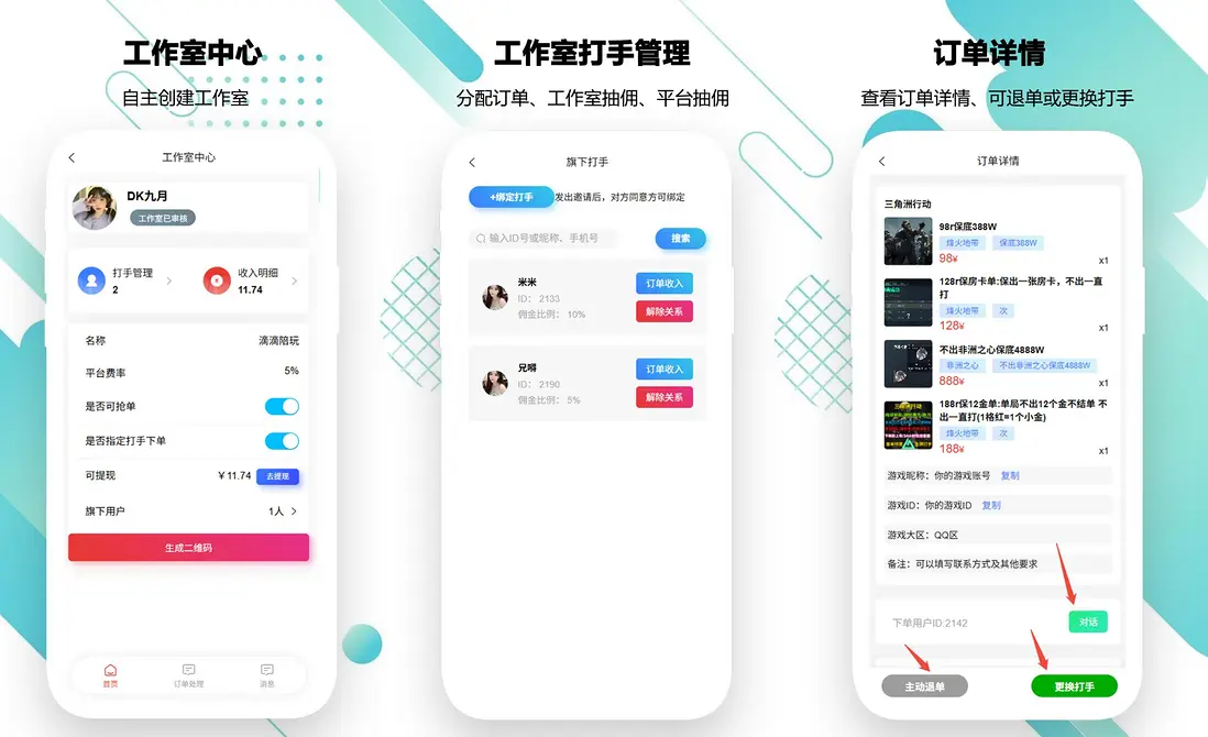 - 代練公司、工會、工作室:可以使用在你的行業領域。快速建立私域客户並實現下單、打手管理和變現能力。