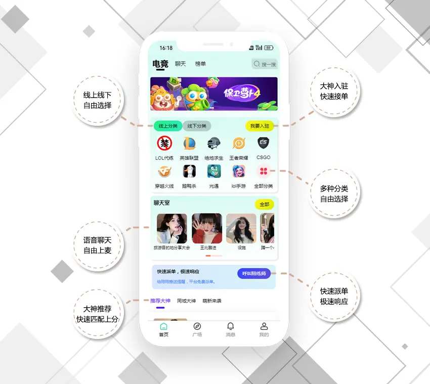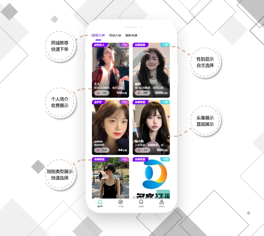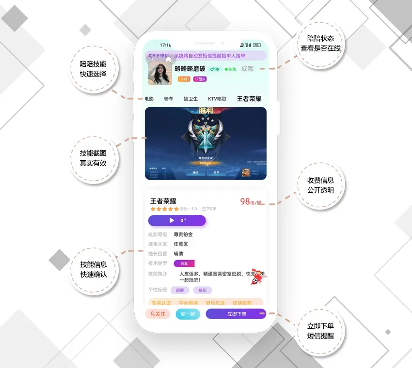 - 功能説明:平台匯聚了海量通過審核的、多才多藝的陪玩達人。用户可根據地點、興趣愛好(如電競、桌遊、攝影、美食探店、徒步、語言練習等)、性別偏好及口碑評分進行精細化篩選。一鍵下單後,即可通過內置即時通訊系統與達人溝通細節,線下共度美好時光。