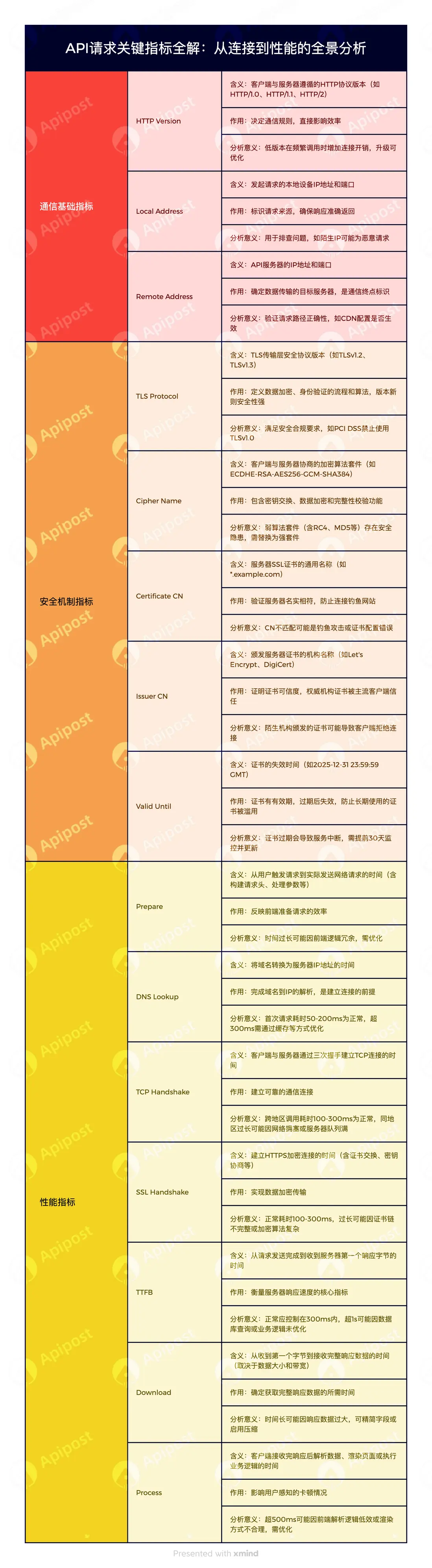 理解這些指標,能幫我們在開發時提前規避風險,測試時精準定位問題,運維時高效排查故障。下次分析API請求,不妨按“通信→安全→性能”的邏輯拆解,你會發現每個數字背後都藏着優化的空間。