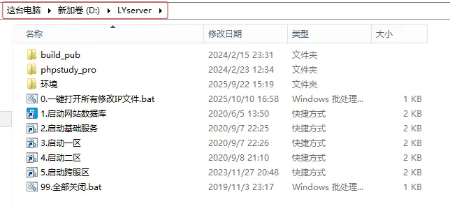 點擊D:\LYserver\目錄下的0.一鍵打開所有修改IP文件會自動打開所有要修改 IP 的文件,將 IP(81.68.206.229)全部改為你自己的服務器 IP。