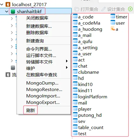 再雙擊數據庫shanhaitbkfflow,找到資源中的數據庫shanhaitbkfflow.js導入。全部運行導入後,鼠標右鍵數據庫點擊刷新就可以看到導入的所有數據庫集合啦。