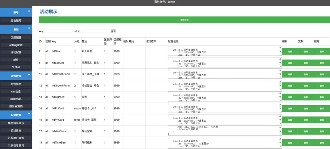 運營後台鏈接:http://IP:4030,默認賬號:admin,密碼:123456,運營後台功能包括活動配置,郵件發送,查看玩家數據等,功能還是很強大的。