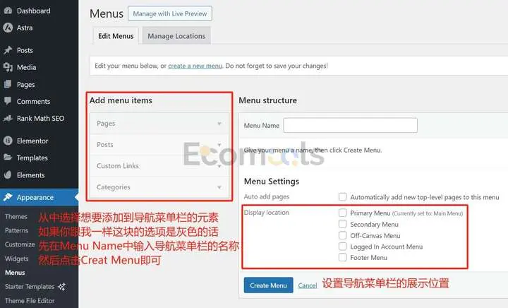 1. 將想要的元素添加至導航菜單欄。從左側的選項中選擇我們想要添加到導航菜單欄的元素,如果這塊選項是灰色的話,那麼先給這個導航菜單欄命名,點擊Create Menu即可正常選擇。