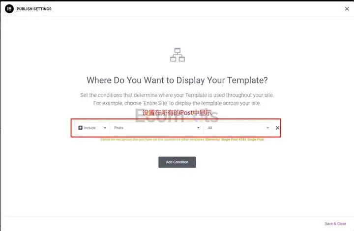 12. 設置Post模板的條件邏輯展示。點擊右上側的下箭頭,選擇Display Conditions(注意,這個是Post模板的展示條件,第12步是右側容器的展示條件,可以組合使用。)