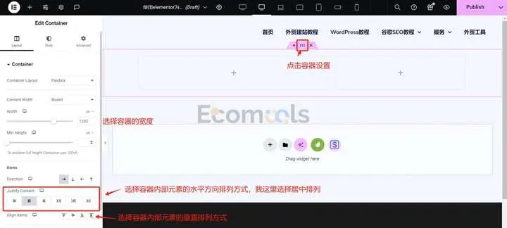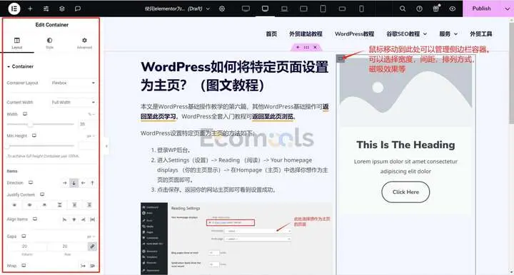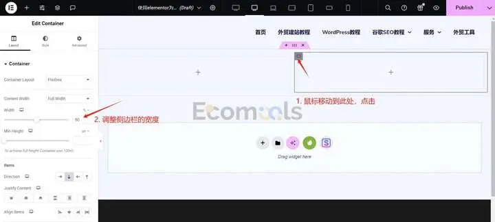 6. 調整小容器。選擇完佈局結構以後,Elementor生成了三個容器,一個大容器,大容器裏面有左右兩個小容器。鼠標移動至右側小容器,點擊左上方的設置,調出容器設置選項,我們在這裏調整側邊欄的寬度。