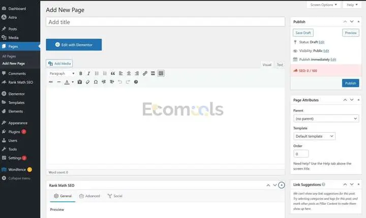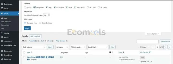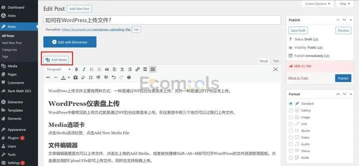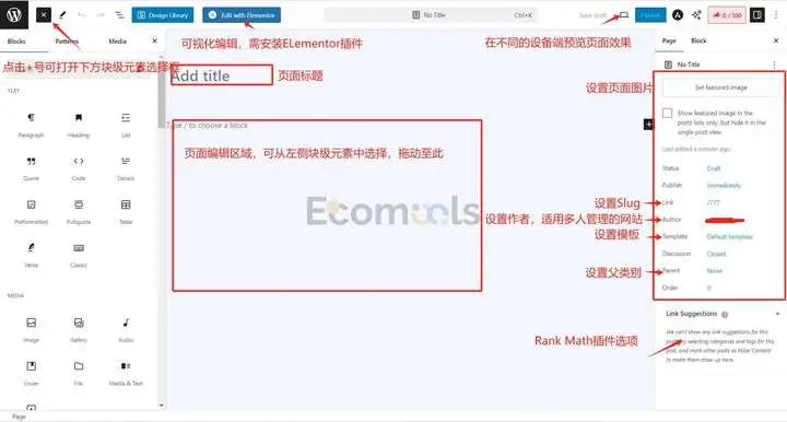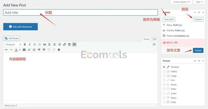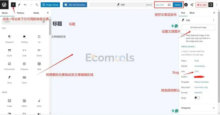 Add New Posts 可以創建新的文章,可以使用WordPress的編輯器添加文本、圖片、視頻等內容。有些主題默認是塊級編輯器(個人用不習慣)。如果我們安裝了Elementor插件,那就可以點擊左邊的 Edit with Elementor 按鈕進入可視化編輯界面。