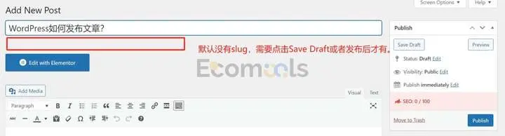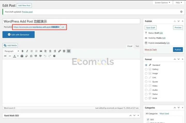 當我們點擊Save Draft後,上面的界面就會多出該Post的Permalink(永久鏈接),我們可以在上面進行Slug的設置和優化。