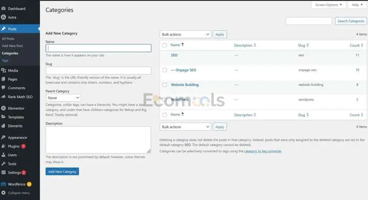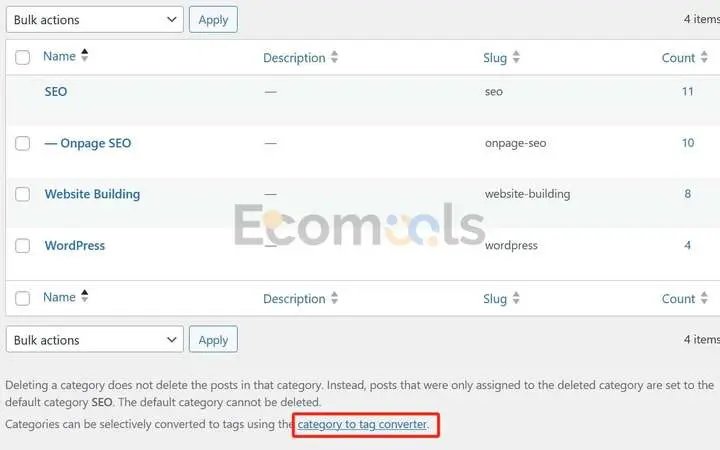 Categories裏面可以管理文章的分類,幫助組織內容。我們新建分類的時候輸入分類名點擊保存就會自動幫我們生成分類的slug。Parent Category就是可以讓我們選擇父分類。比如我的Onpage SEO分類就是SEO分類下的子分類。