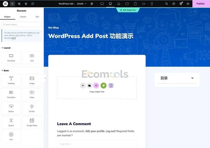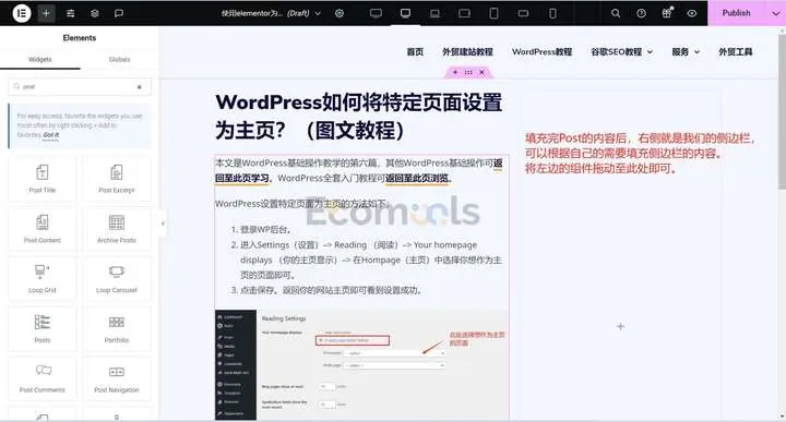 9. 填充側邊欄位置元素。填充完Post的內容後,右側容器現在其實就是我們的側邊欄,我們可以根據自己的需要將左側元素拖拽至右側容器中。