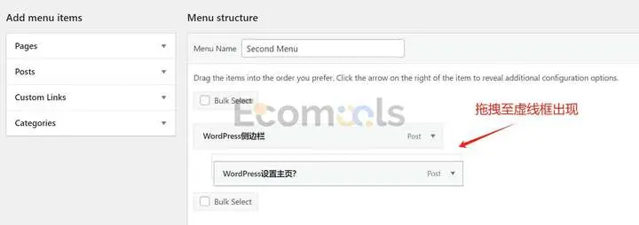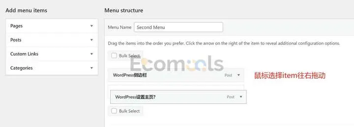 比如説我這裏有兩個選項,我想要“WordPress設置主頁”成為“WordPress側邊欄”的子欄目,只需要用鼠標點擊“WordPress設置主頁”往右拖動。