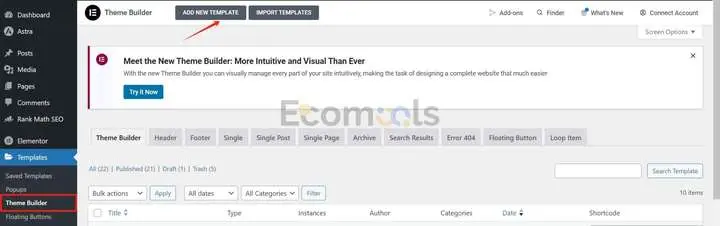 1. 登錄WP後台。點擊WP左側側邊欄的 Templates –> Theme Builder。