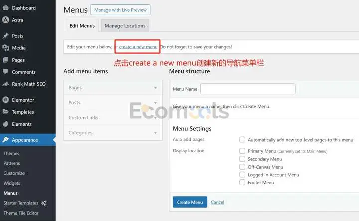 登錄WP後台,通過Appearance –> Menus即可進入到WordPress的菜單設置界面。點擊create a new menu。