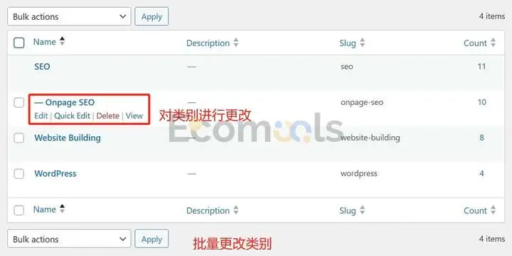 右側的“類別表”中可以看得到我們當前網站的所有類別,以及每個類別下的文章有多少。如果將鼠標移到某個類別上,則會出現一組選項,允許我們編輯、快速編輯或刪除該類別(默認類別不可刪除,但是可以更改名稱和Slug)。