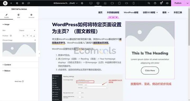 點擊Edit with Elementor進入可視化頁面編輯界面後,可以通過拖拽組件的方式來進行頁面製作。左邊就是可用的組件,鼠標按住拖到右邊的區域即可。